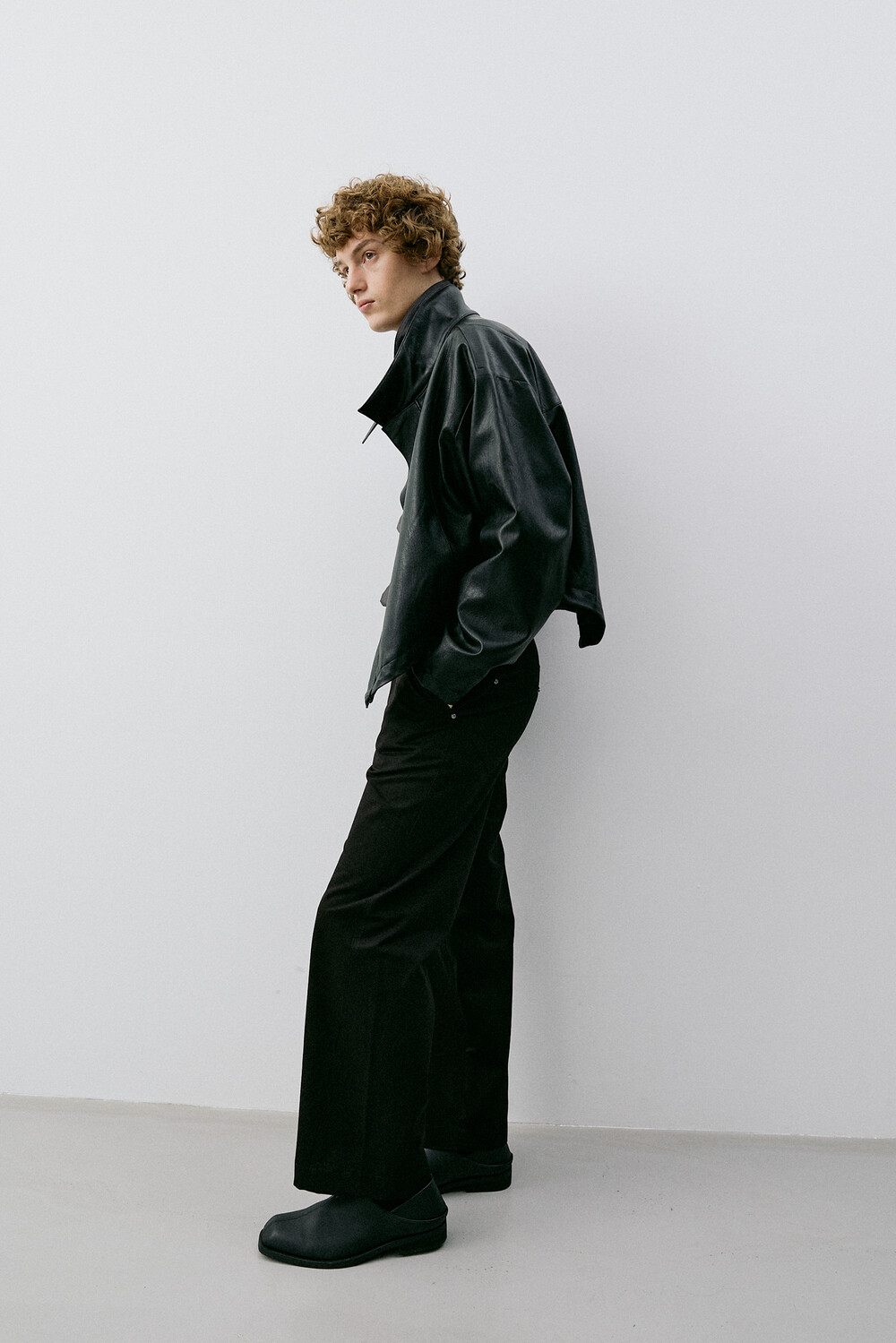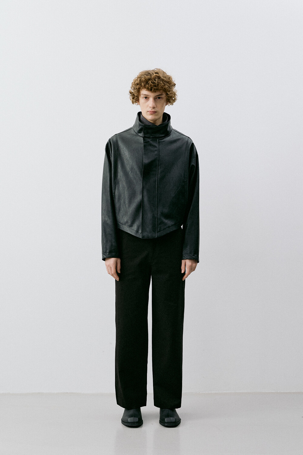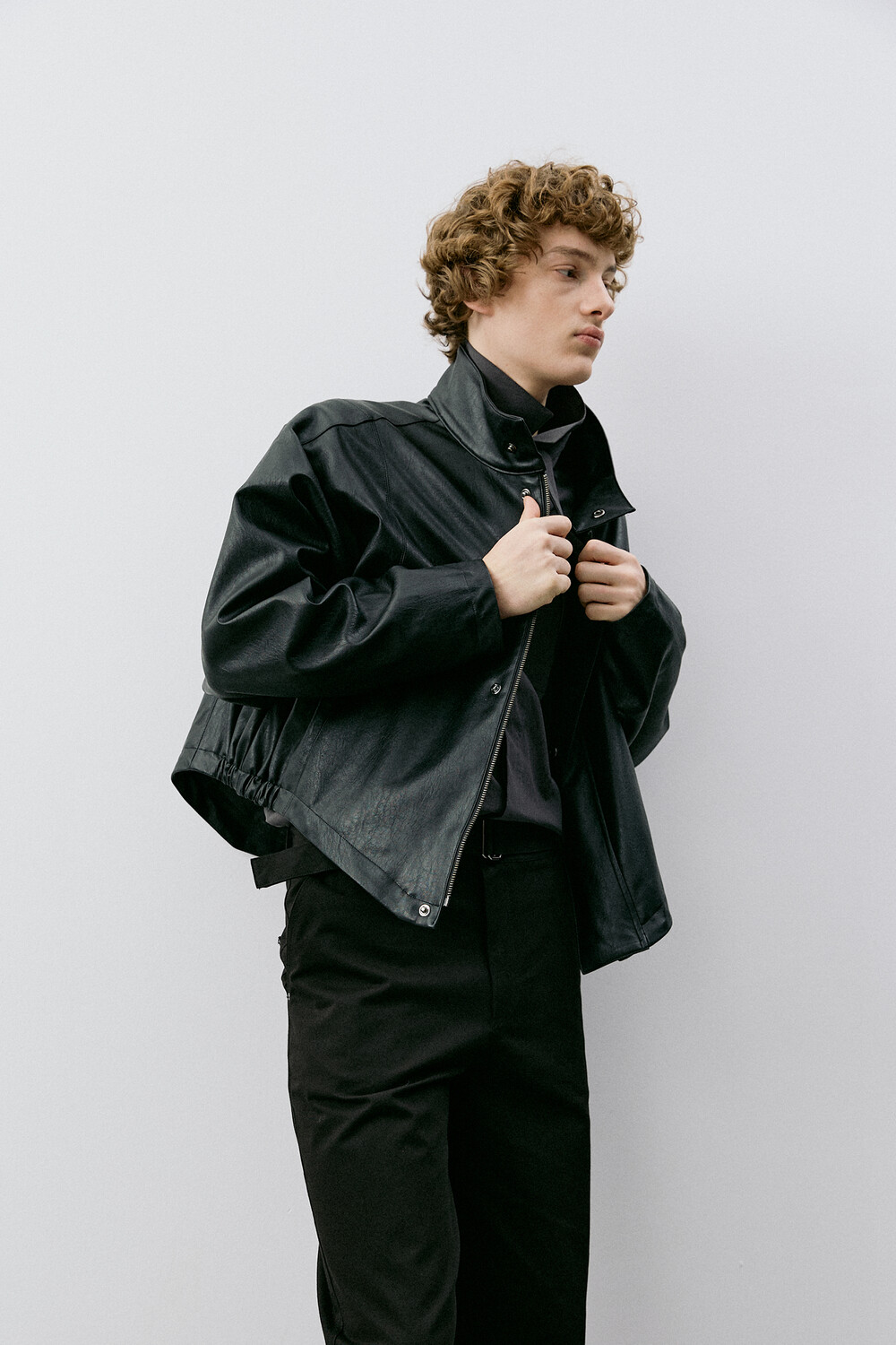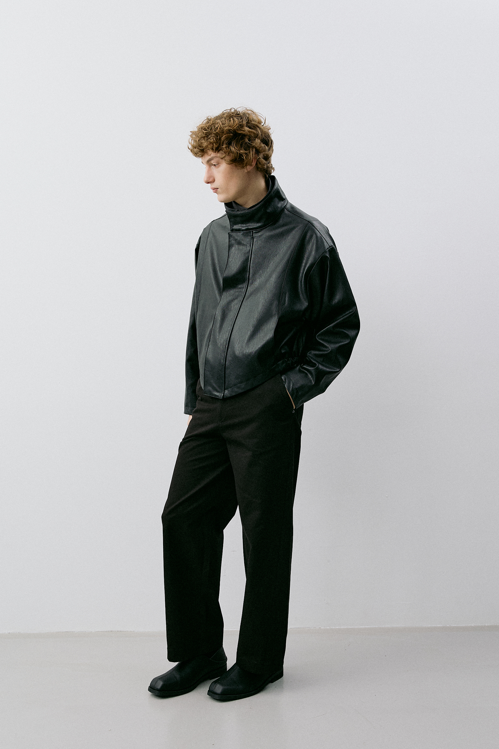 ∙ 텍스처감 있는 합성피혁 소재의 하이넥 가죽점퍼