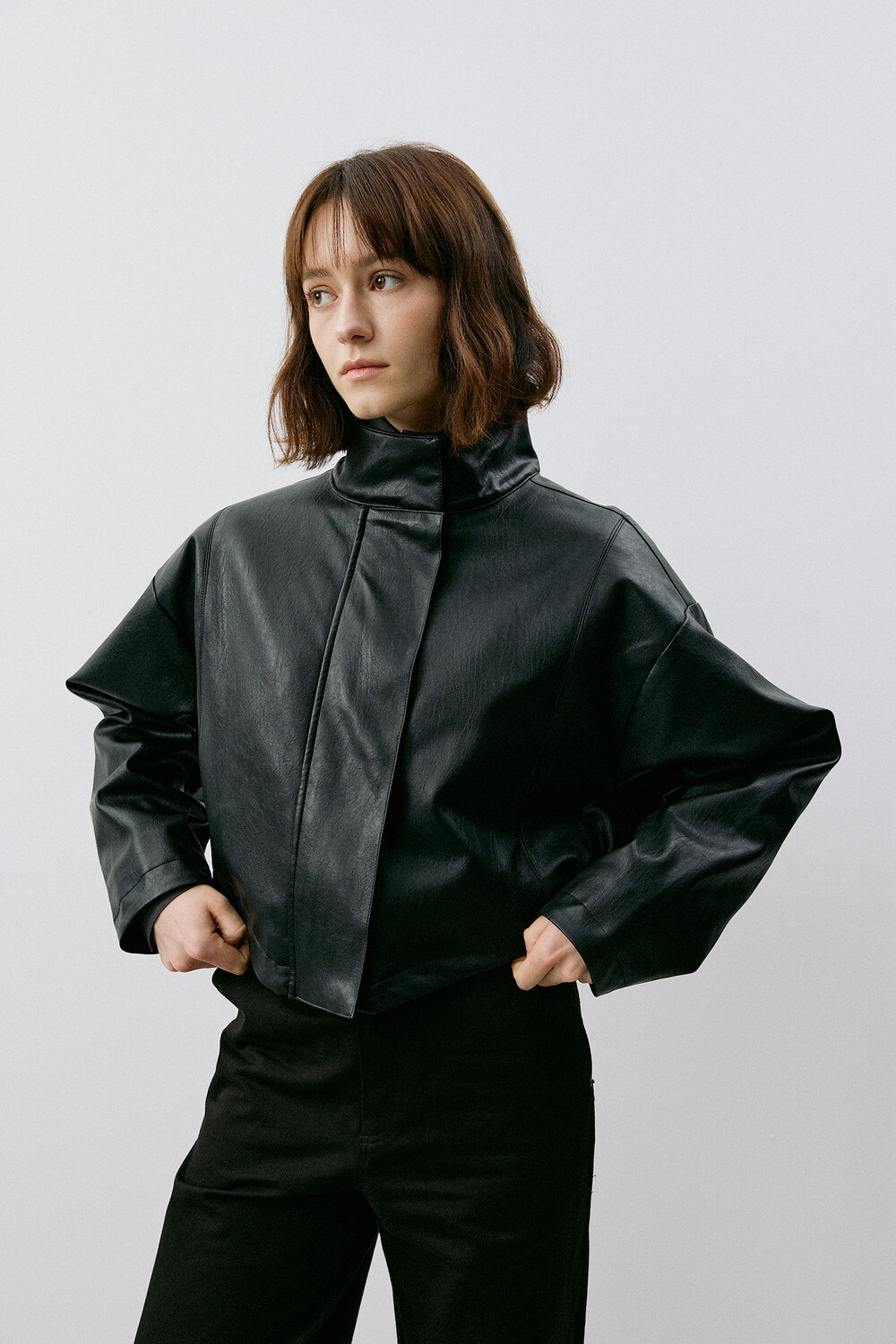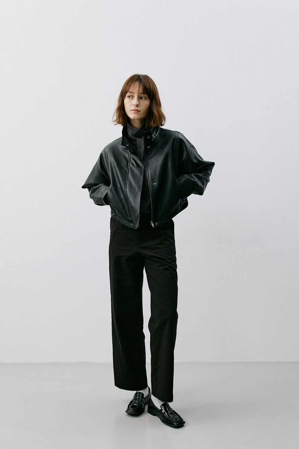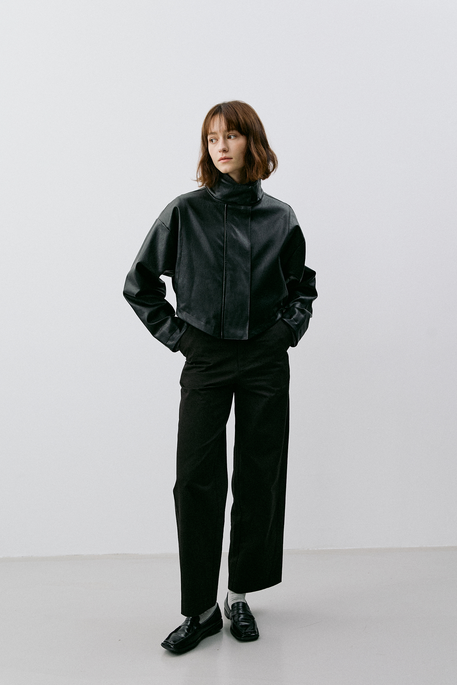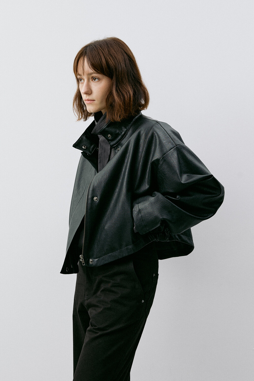 ∙ 텍스처감 있는 합성피혁 소재의 하이넥 가죽점퍼