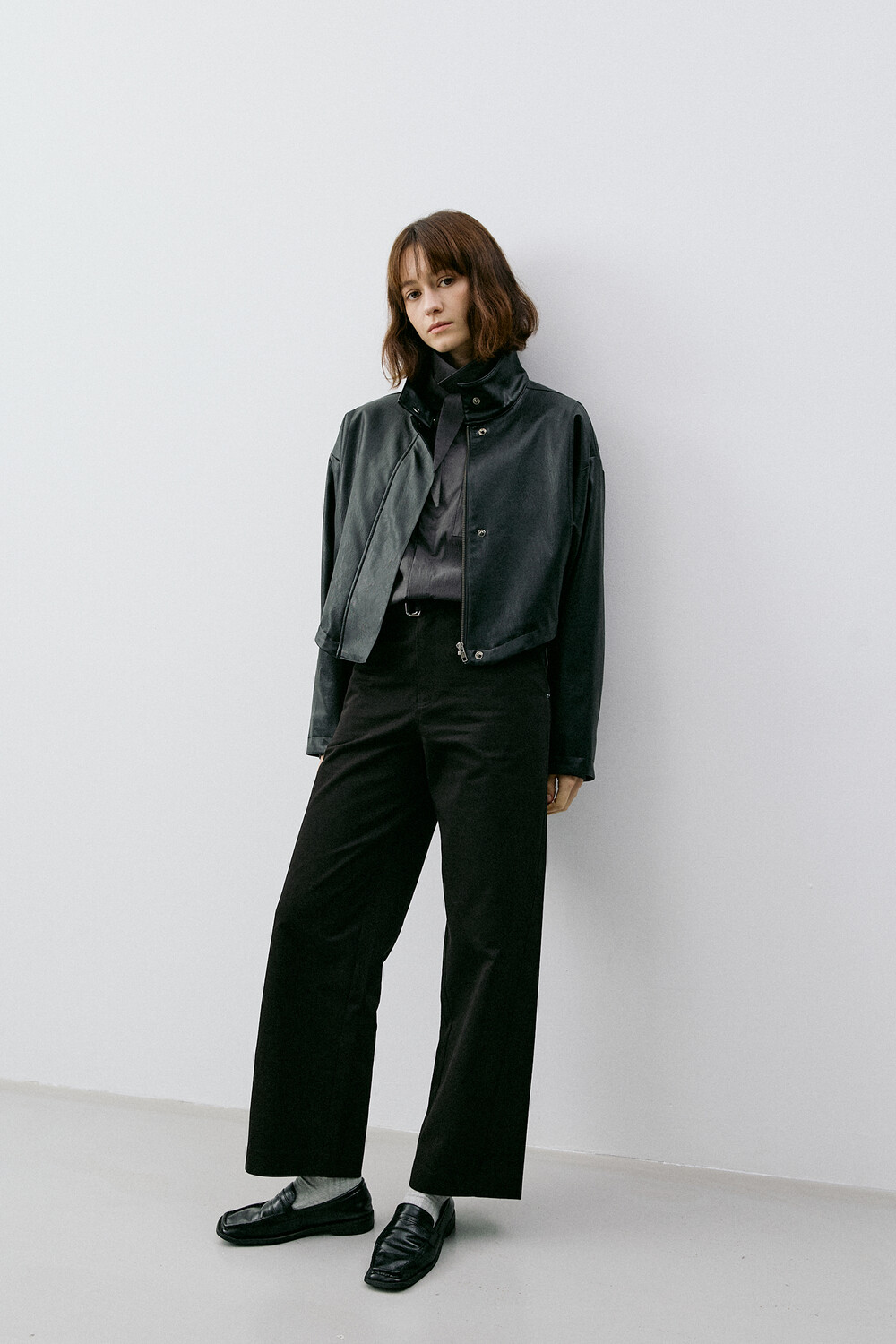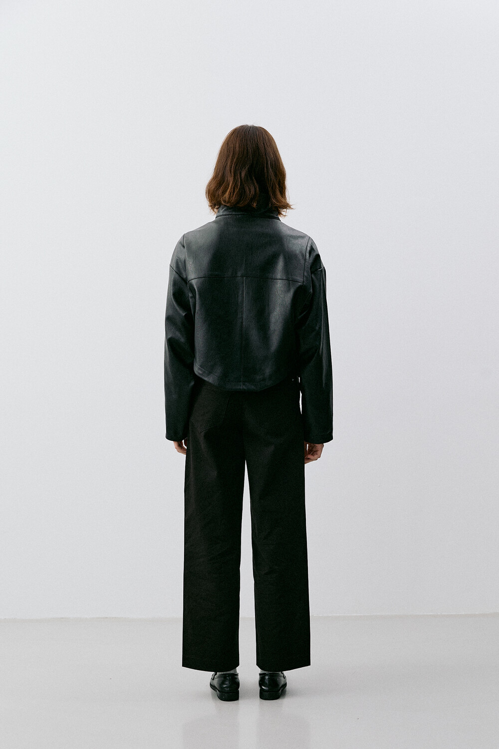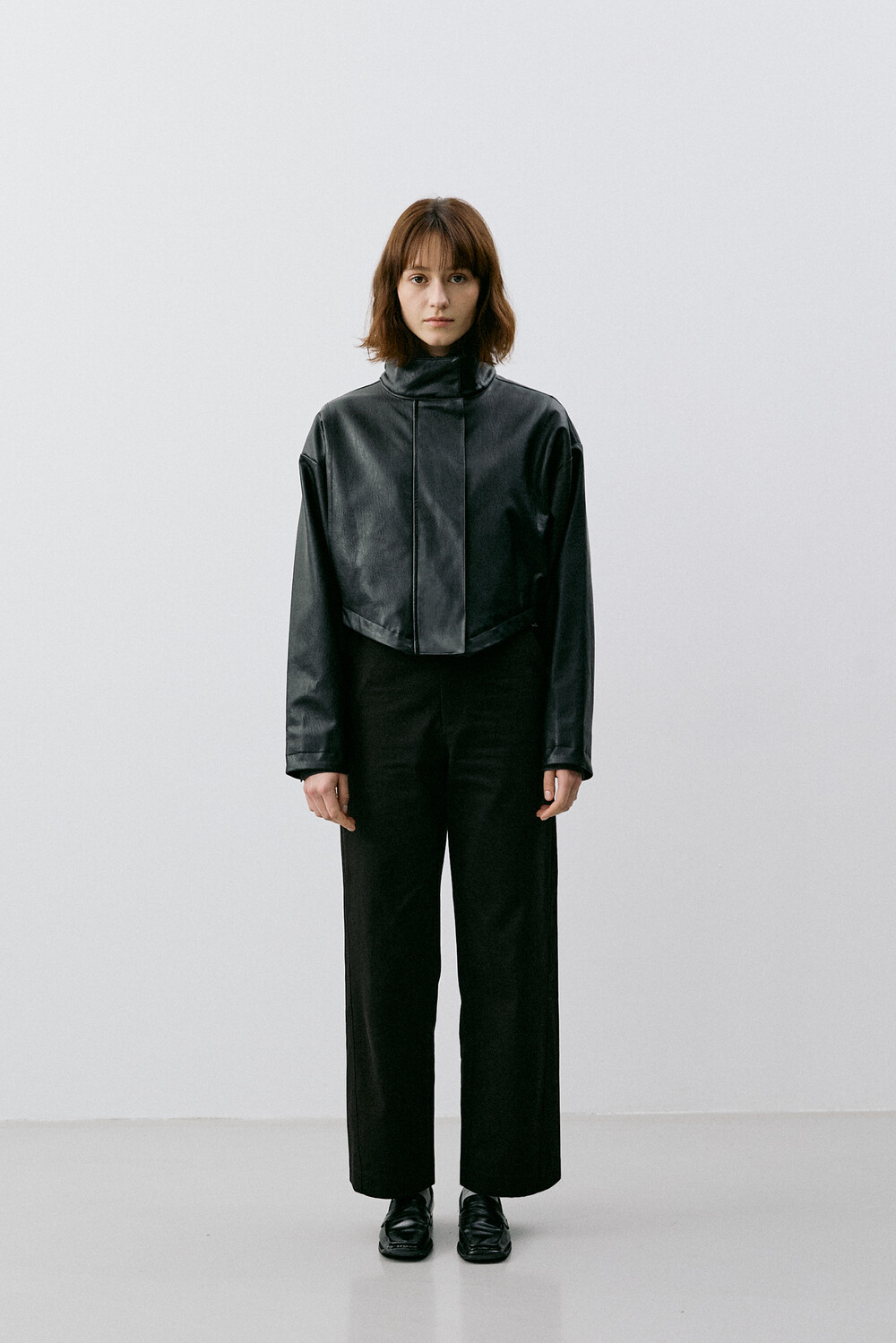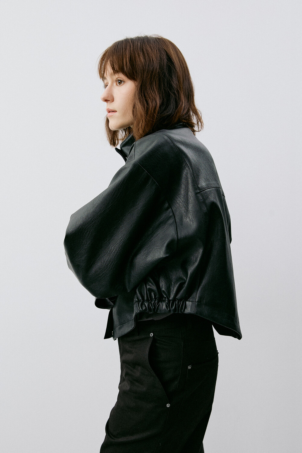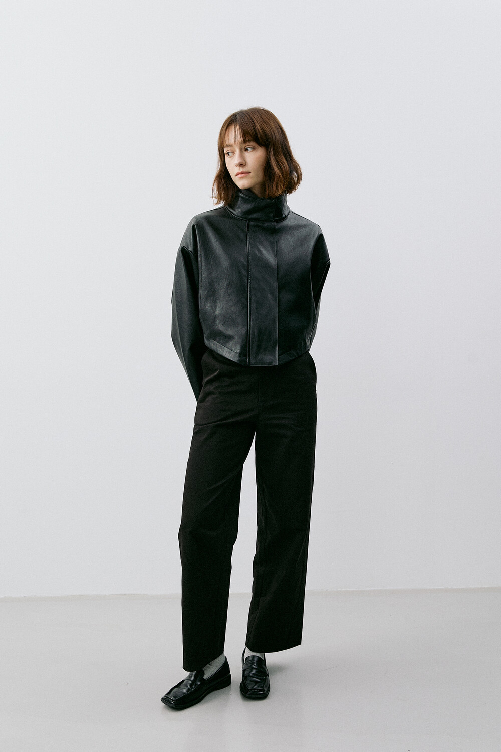 ∙ 텍스처감 있는 합성피혁 소재의 하이넥 가죽점퍼