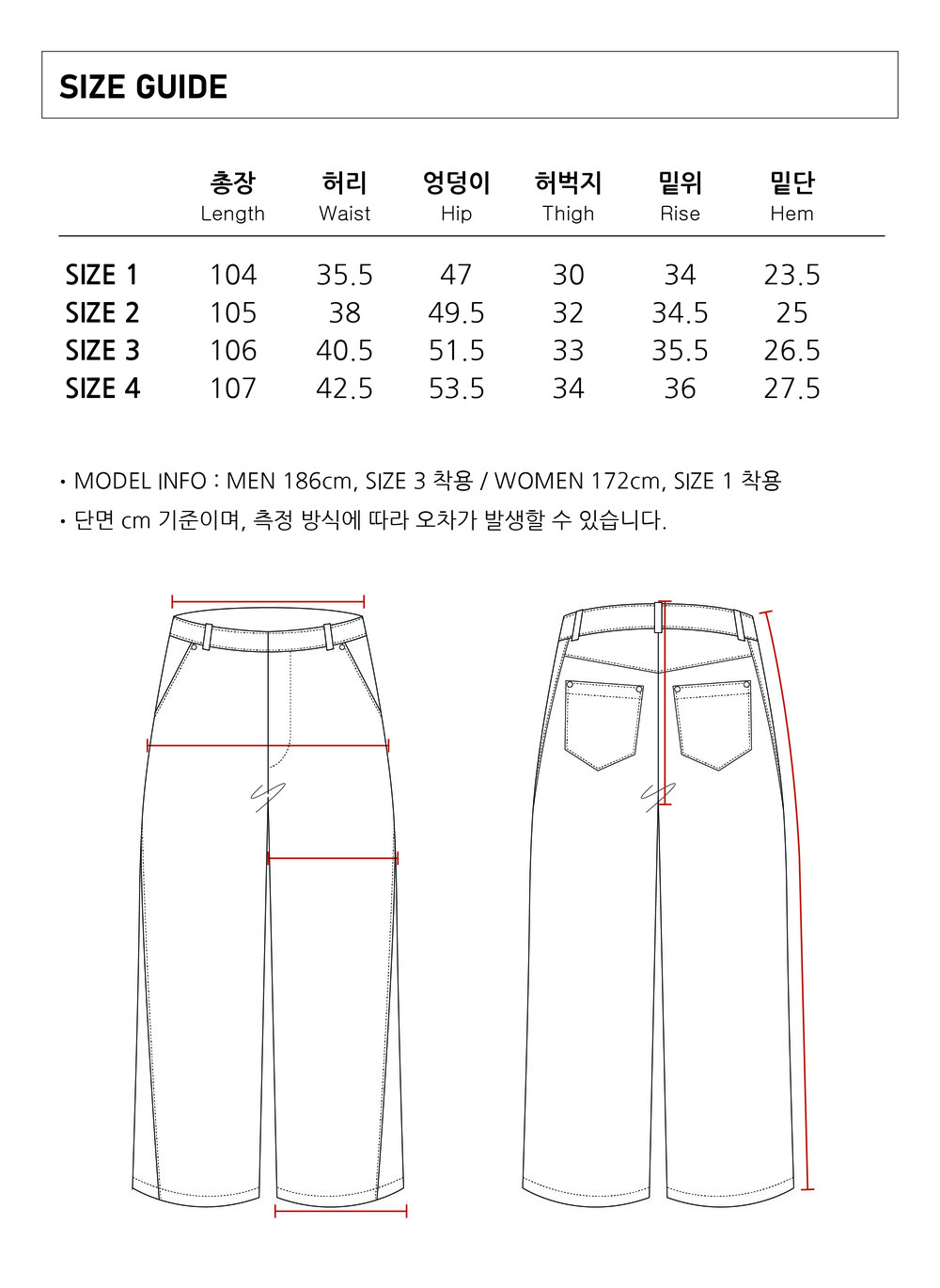 총장 : 104 / 허리단면 : 35.5 / 엉덩이단면 : 47 / 허벅지단면 : 30 / 밑위 : 34 / 밑단단면 : 23.5