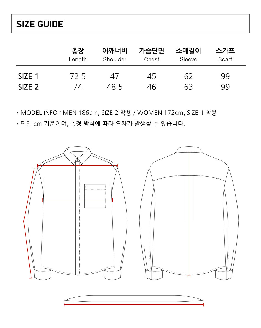 총장 : 74 / 어깨너비 : 48.5 / 가슴단면 : 46 / 소매길이 : 63